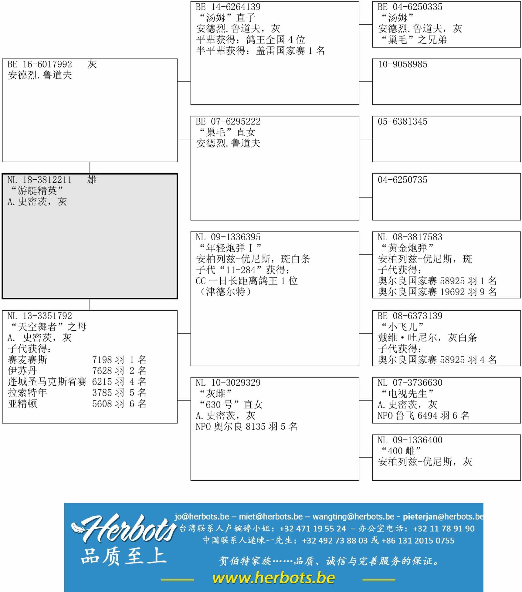 父亲: “汤姆之孙” B16-6017992 安德烈·鲁道夫原舍基础种鸽“汤姆”之孙B04-6250335 “汤姆” 之子代获得:15年奥林匹克代表鸽12年盖雷国家赛1名15年盖雷国家赛2名排行榜鸽王全国1位国家赛5-6-7名