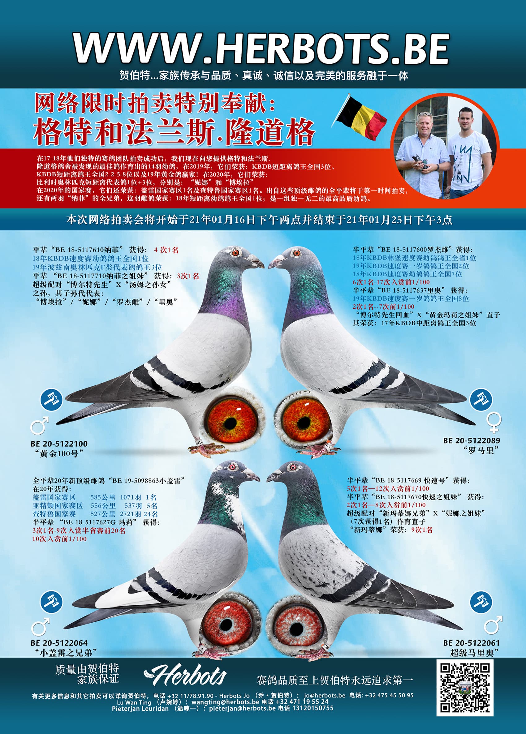 在2020年的国家赛,它们还荣获:盖雷国家赛区1名及查特鲁国家赛区1名。出自这些顶级雌鸽的全平辈将于第一时间拍卖,还有两羽“纳菲”的全兄弟,这羽雌鸽荣获:18年短距离幼鸽鸽王全国1位;是一组独一无二的最高品质幼鸽。