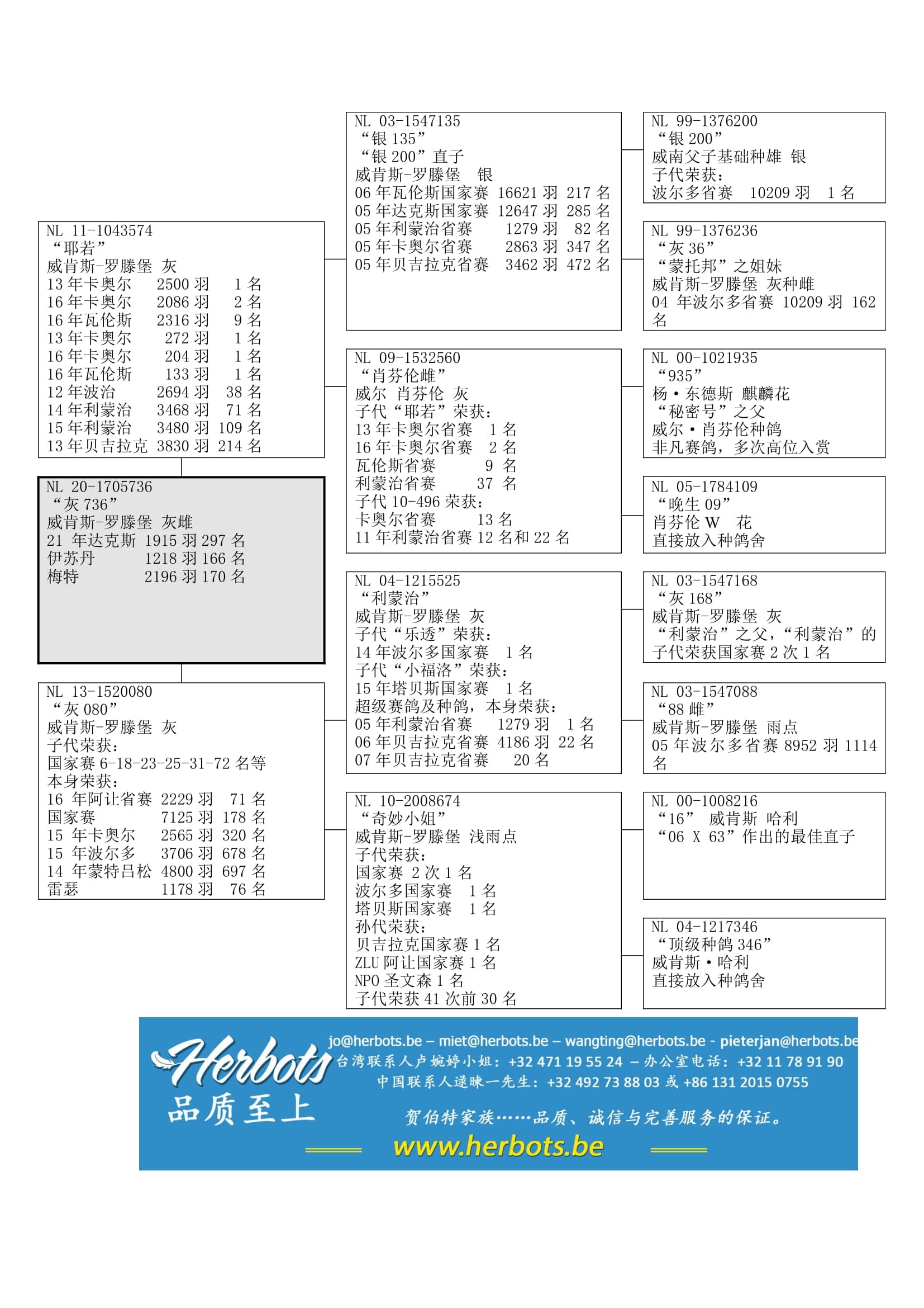 荣获 :利蒙治省赛 1,279羽1名;其子代代表:“乐透” (14年波尔多国家赛1名) 和“小福洛” (15年塔贝斯国家赛1名)
