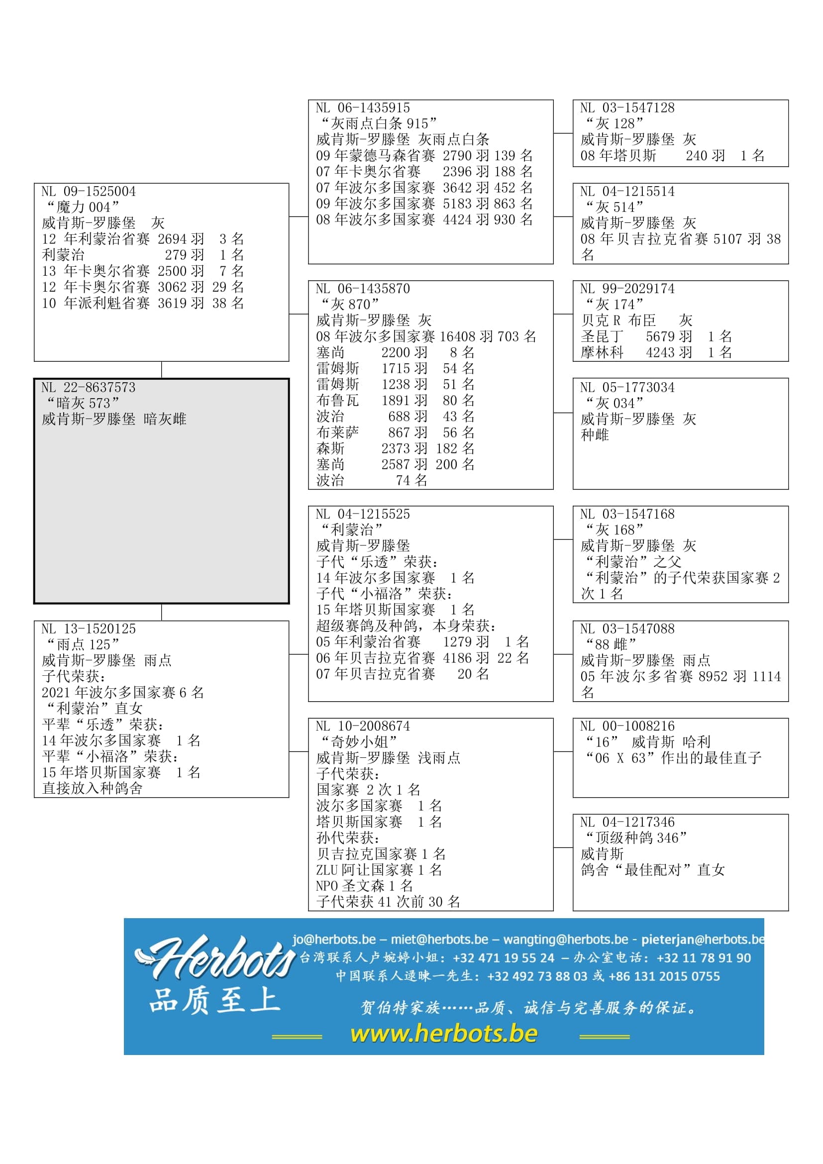 荣获 :利蒙治省赛 1,279羽1名;其子代代表:“乐透” (14年波尔多国家赛1名) 和“小福洛” (15年塔贝斯国家赛1名)