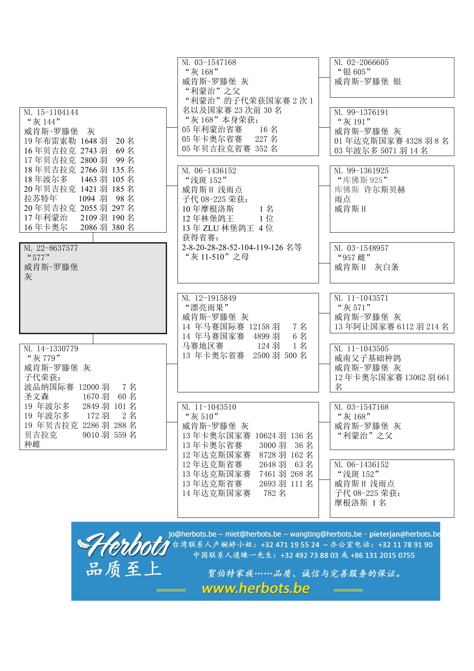 子代荣获: 波品纳国际赛 12,000羽7名 – 圣文森 1,670羽60名 – 波尔多 2,849羽101名 – 贝吉拉克国家赛 9,010羽559名 “漂亮雨果” x “灰 510”直女