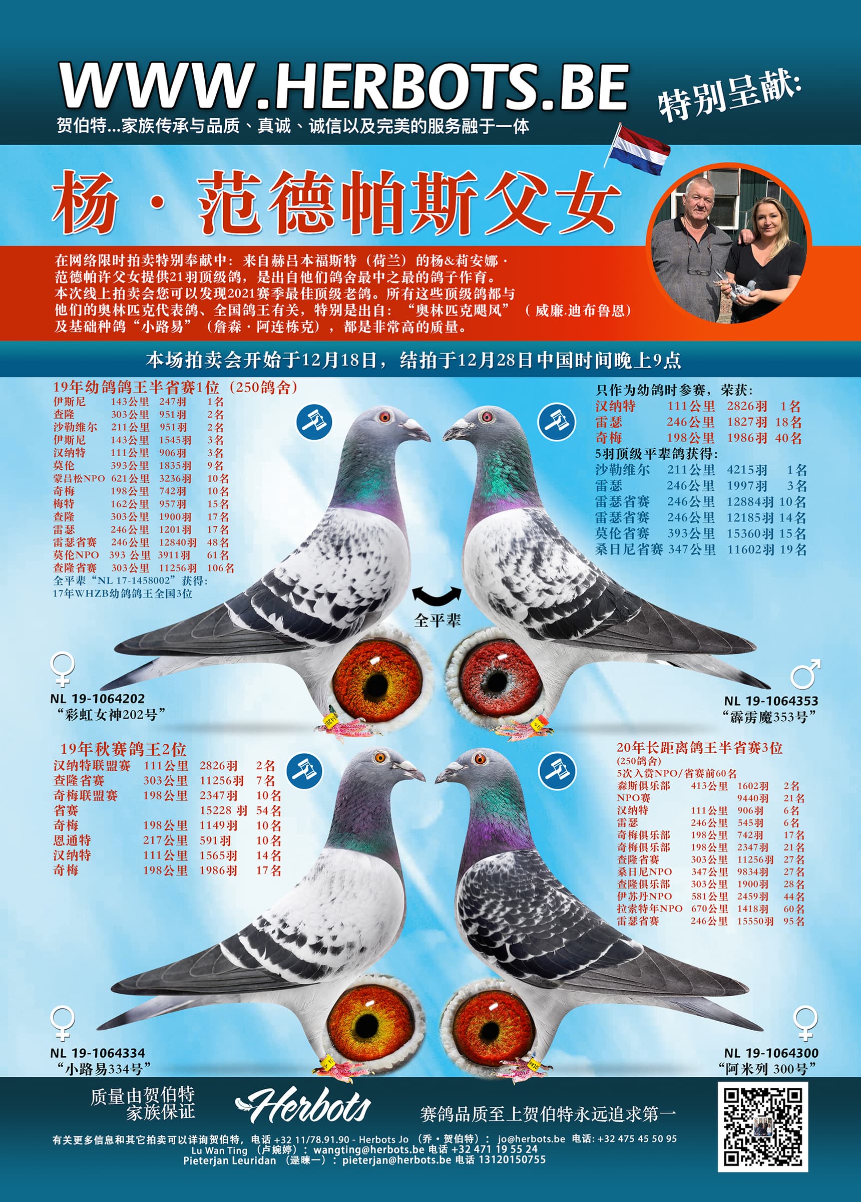 在网络限时拍卖特别奉献中:来自赫吕本福斯特(荷兰)的杨&莉安娜·范德帕许父女提供21羽顶级鸽,是出自他们鸽舍最中之最的鸽子作育。本次线上拍卖会您可以发现2021赛季最佳顶级老鸽。所有这些顶级鸽都与他们的奥林匹克代表鸽、全国鸽王有关,特别是出自:“奥林匹克飓风”( 威廉.迪布鲁恩)及基础种鸽“小路易”(詹森·阿连栋克),都是非常高的质量。