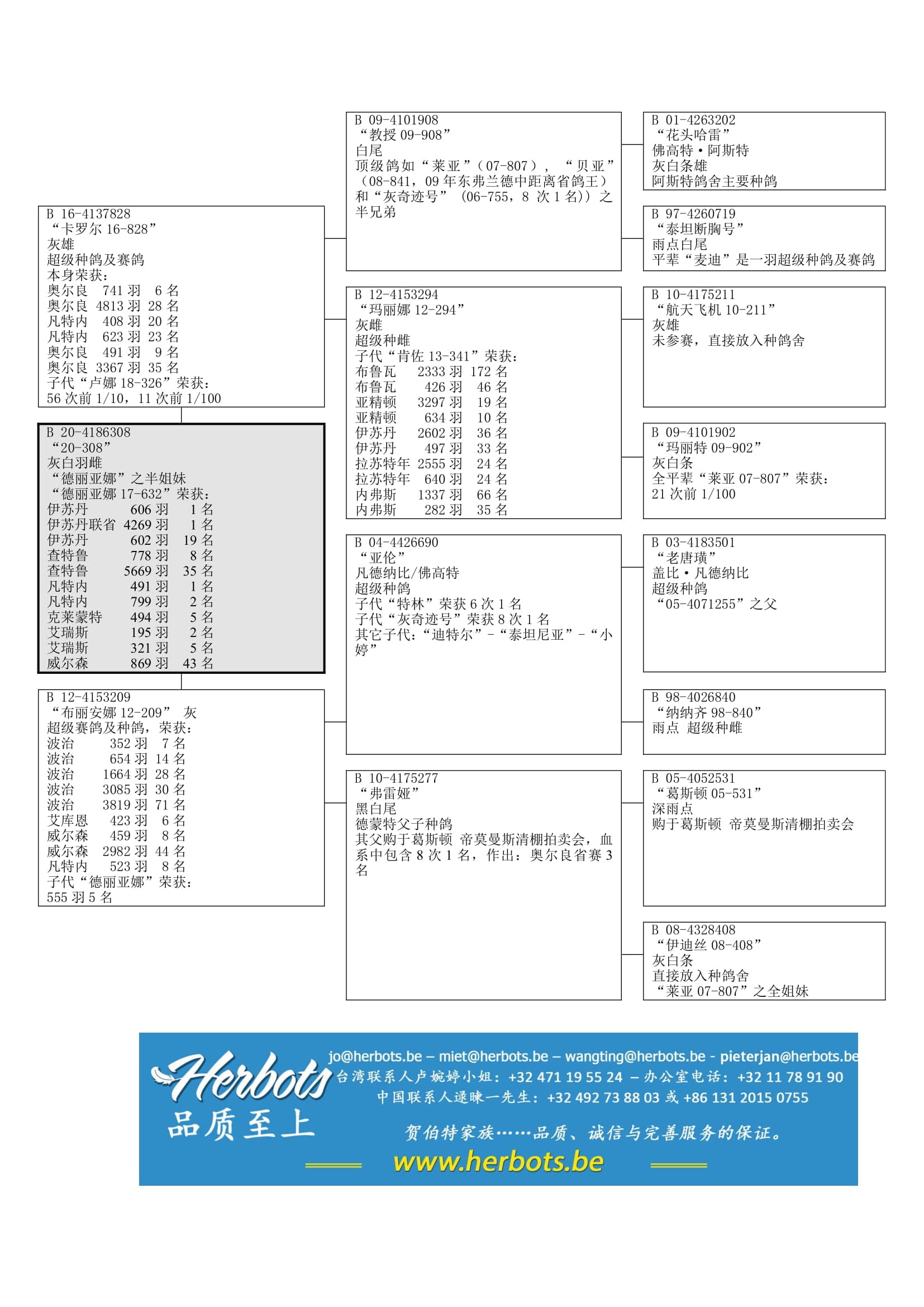 荣获: 波治 352羽7名 – 艾库恩 423羽6名 - 威尔森 459羽8名 – 凡特内 523羽8名 - 等等.