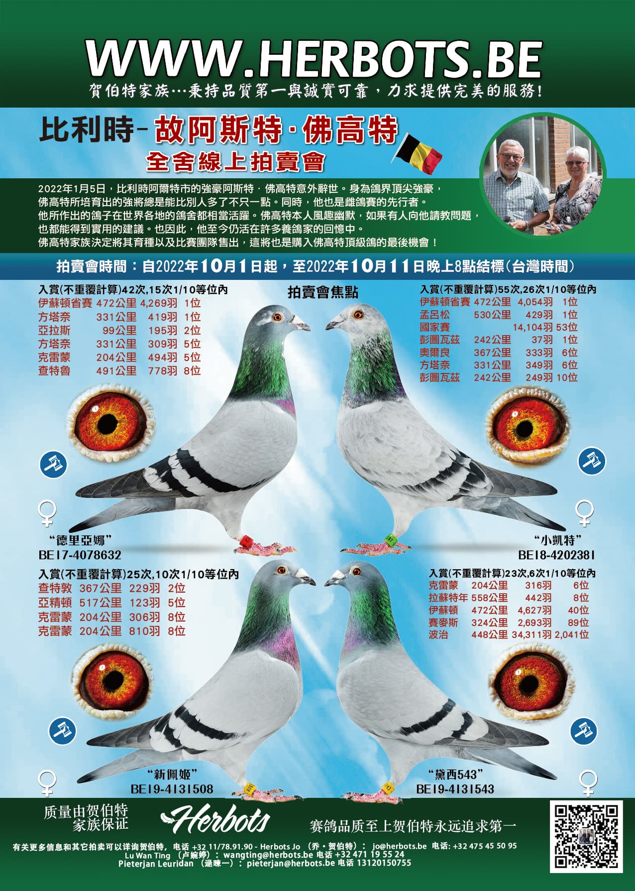 阿斯特·佛高特逝世于2022年1月5日。本场拍卖会提供所有当时存在的种鸽及成绩鸽。