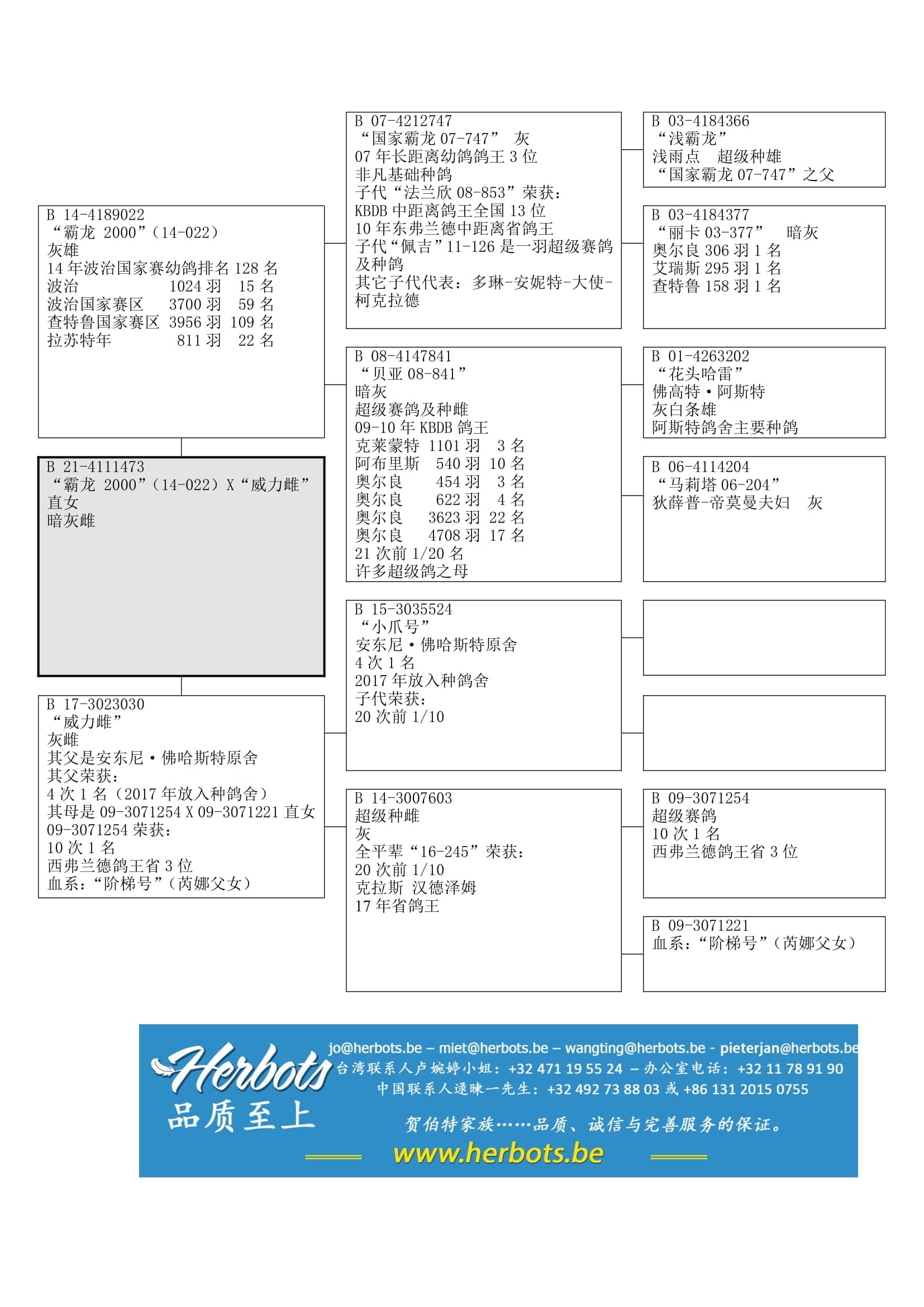 基础种鸽 – 著名子代代表:“法兰欣”, “佩吉”, “多琳”, “安妮特”, “大使”