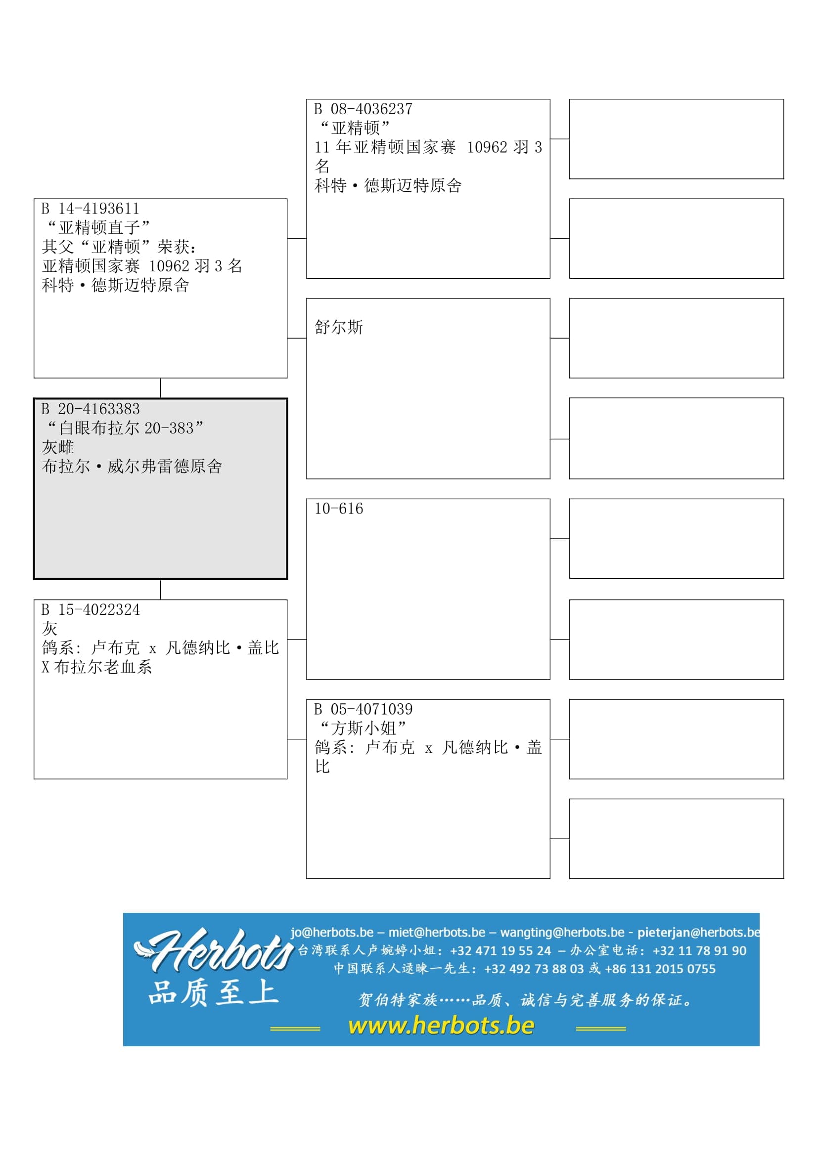 父亲: “B14-4193611 – 科特·德斯迈特原舍 “亚精顿” x “舒尔斯-迪瓦尔雌”直子“亚精顿” B08-4036237荣获:亚精顿国家赛 10,962羽3名