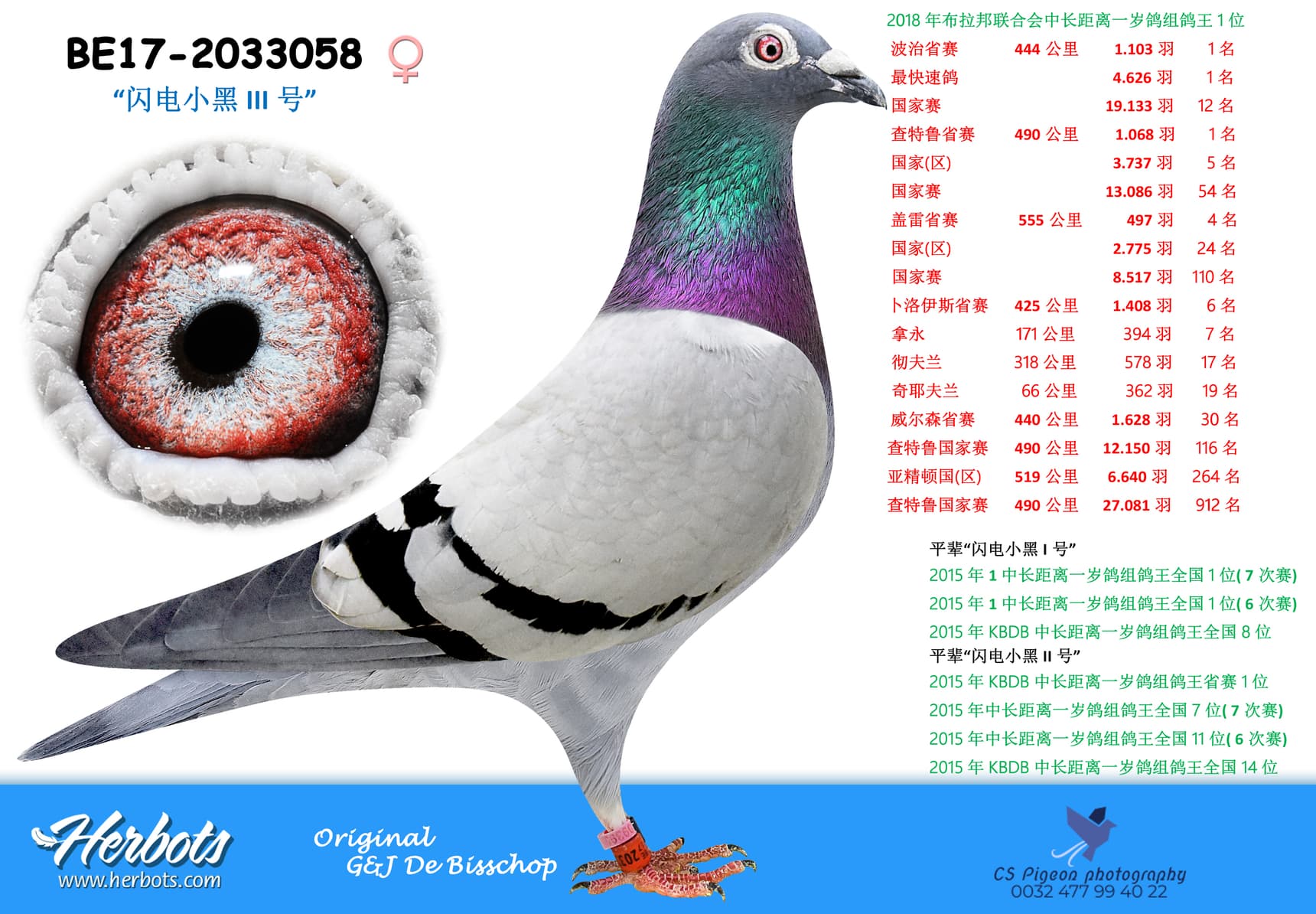 15年中长距离一岁鸽鸽王全国1位(6场比赛)
