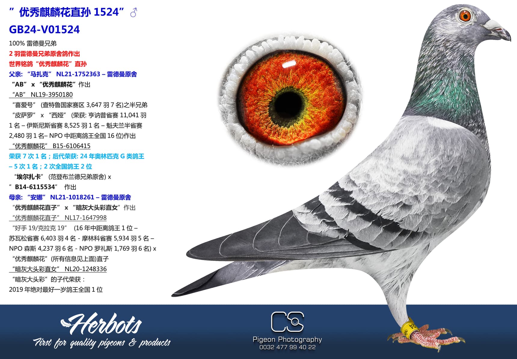 荣获 7次1名;后代荣获: 24年奥林匹克G类鸽王