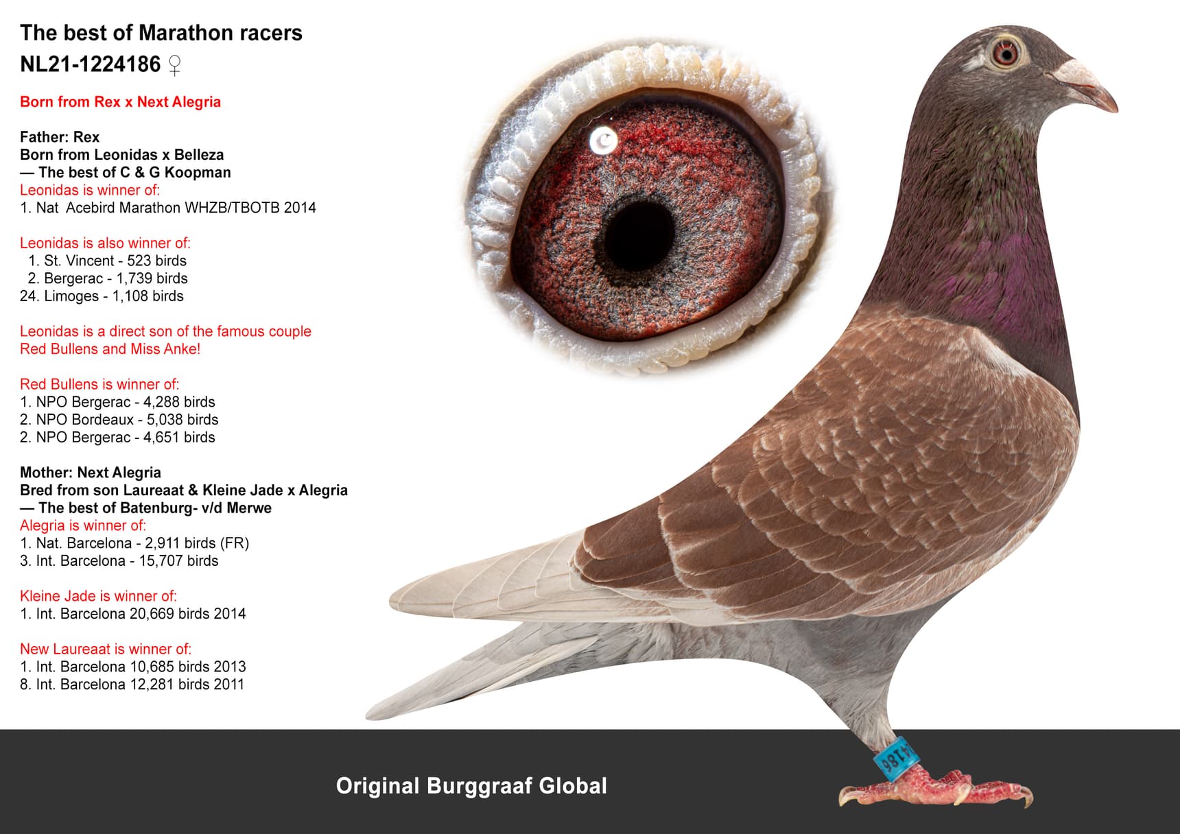 Specially from the breeding loft of Burggraaf Global. This pigeon has not been raced!