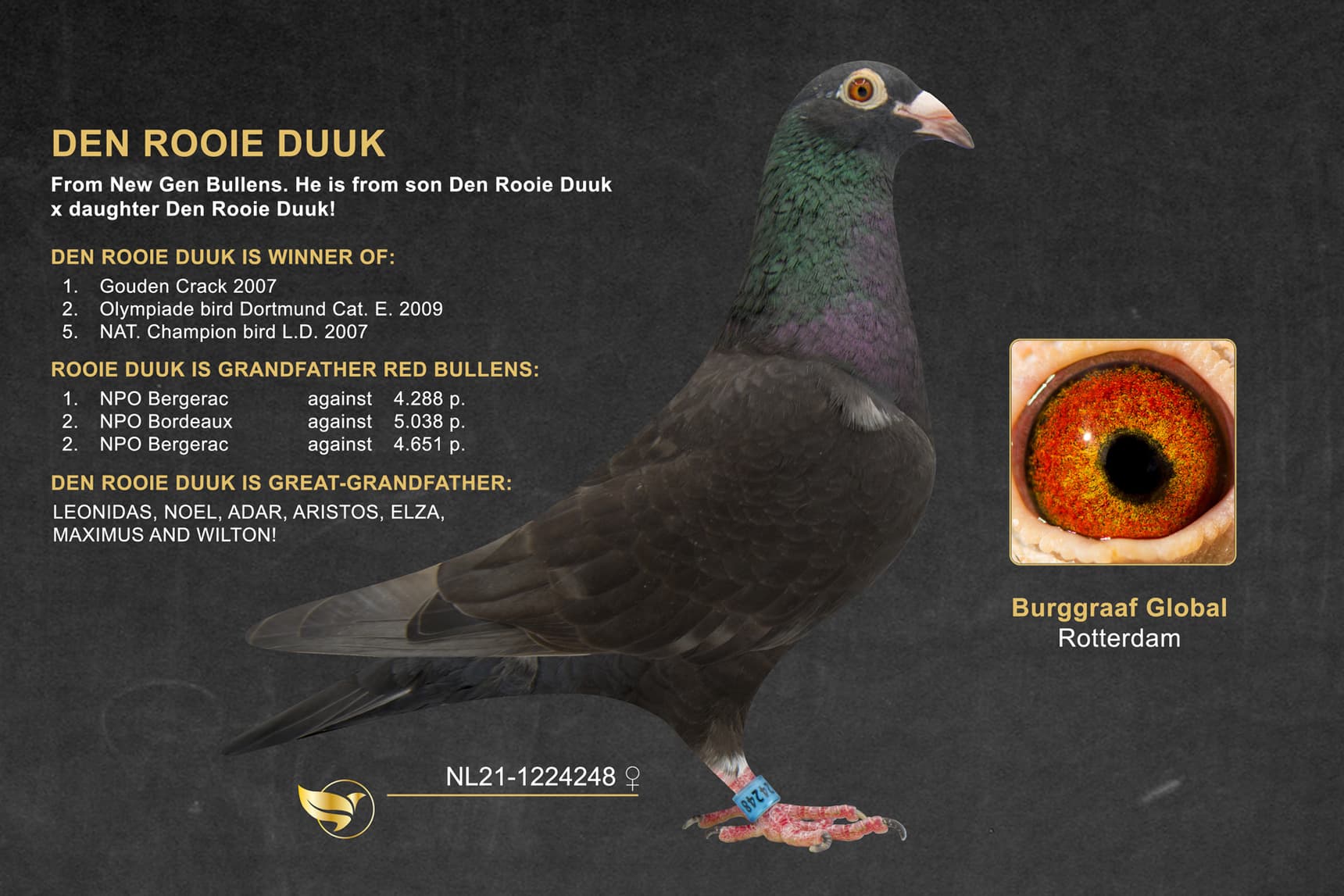 Den Rooie Duuk was just like his grandson Red Bullens a phenomenal racer on the marathon! Also he grew into an absolute legendary breeder in the pigeon sport.