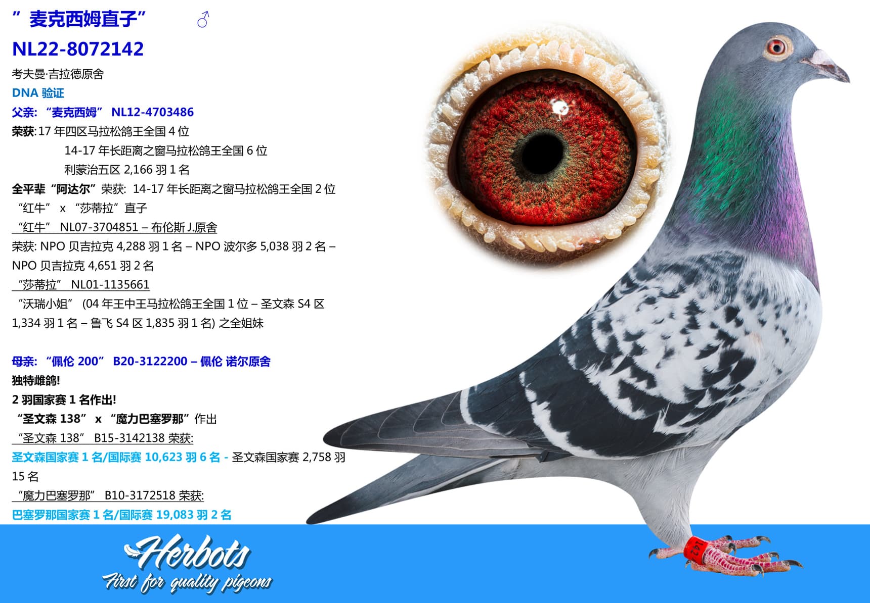 “沃瑞小姐” (04年王中王马拉松鸽王全国1位 – 圣文森 S4区1,334羽1名 – 鲁飞 S4区1,835羽1名) 之全姐妹